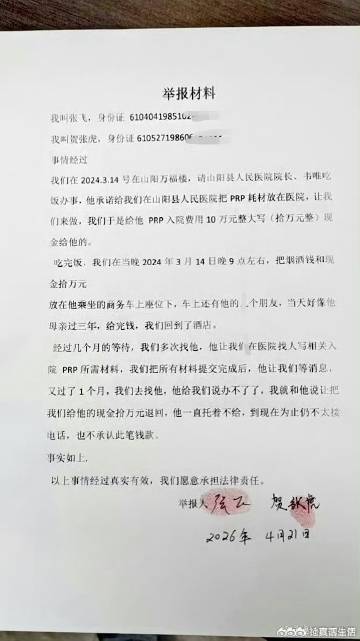 商洛山陽(yáng)縣人民醫(yī)院副院長(zhǎng)魏某被舉報(bào)收受賄賂、合作未果且拒退錢,雙方各執(zhí)一詞。10萬元現(xiàn)金是否退還、舉報(bào)人下跪是索款還是敲詐、紀(jì)委是否介入,三大核心疑點(diǎn)懸而未決。此事不僅關(guān)乎個(gè)別干部的廉潔清白,更牽動(dòng)群眾對(duì)基層醫(yī)療管理的信任,紀(jì)檢監(jiān)察部門必須迅速?gòu)夭,以鐵證還原真相,給公眾一個(gè)負(fù)責(zé)任的交代。